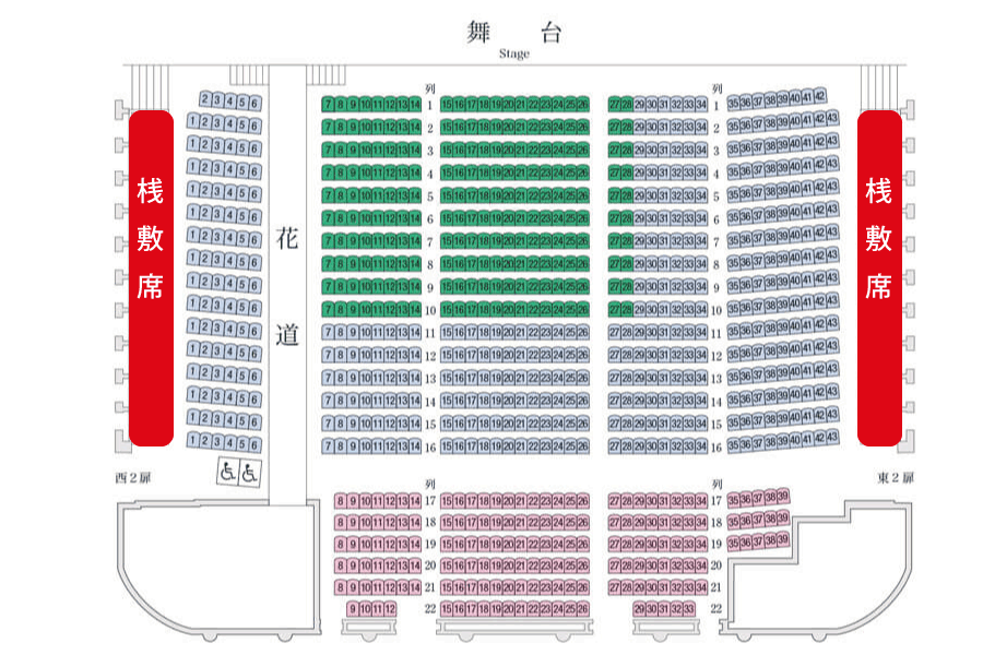 - Unobstructed views of both the stage and the hanamichi (runway).