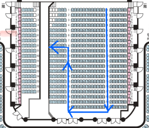 秘密の草原に行くときに客席降りがあるんですが青線のルートを通って8列目前後の客席の間を通り