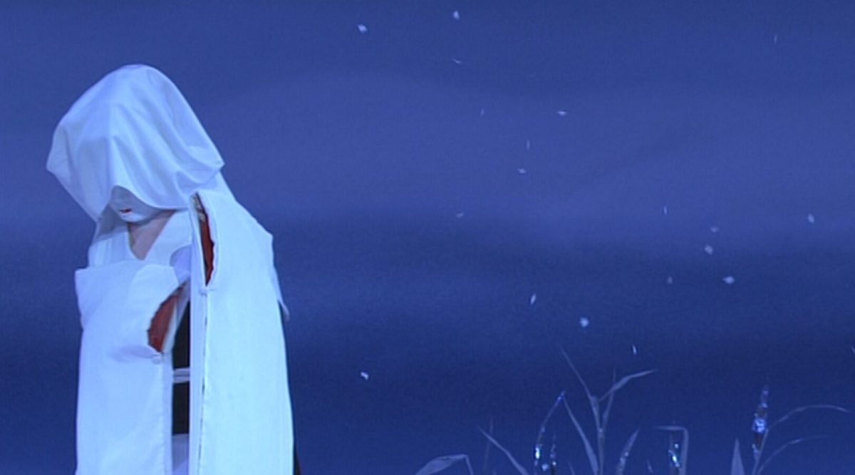 The figure first appears in pure white robes, neither clearly human nor clearly a bird, then becomes a young woman consumed by love, and finally transforms back into a heron.