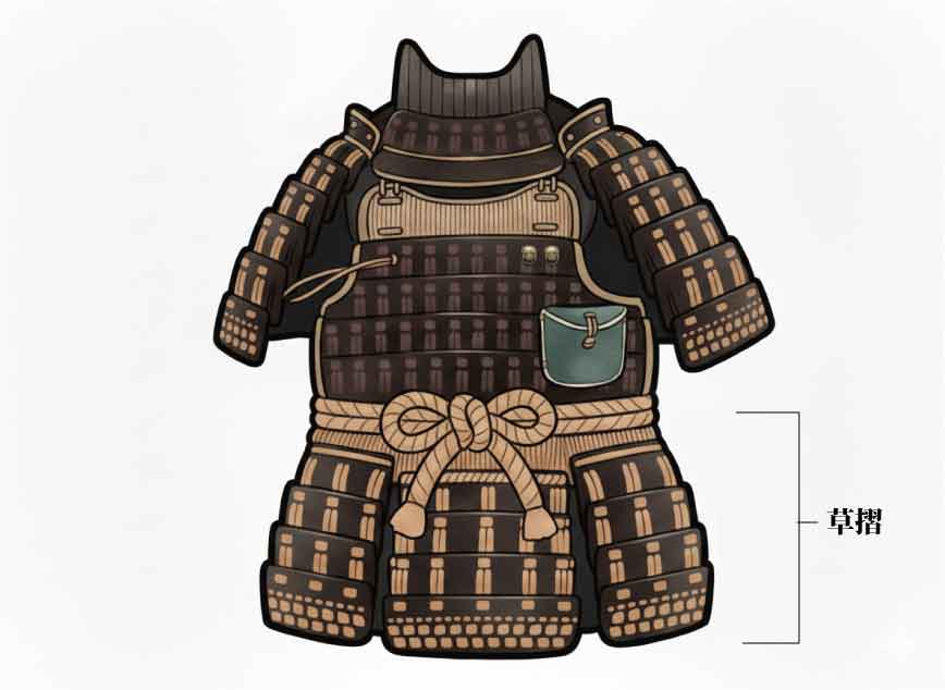 「草摺」とは、武者が身にまとう鎧の下部にあたる部分で、前後左右に垂れ、ひらりと動くスカート状の防具のことです。